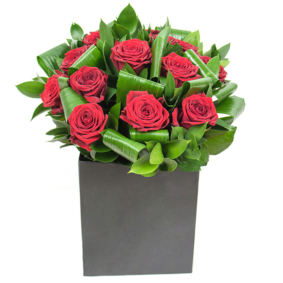 Bring elegance to your home with our unique bouquet featuring red roses, complemented by rich aspidistra leaves and elegant ruscus. This arrangement offers a perfect blend of beauty and style.